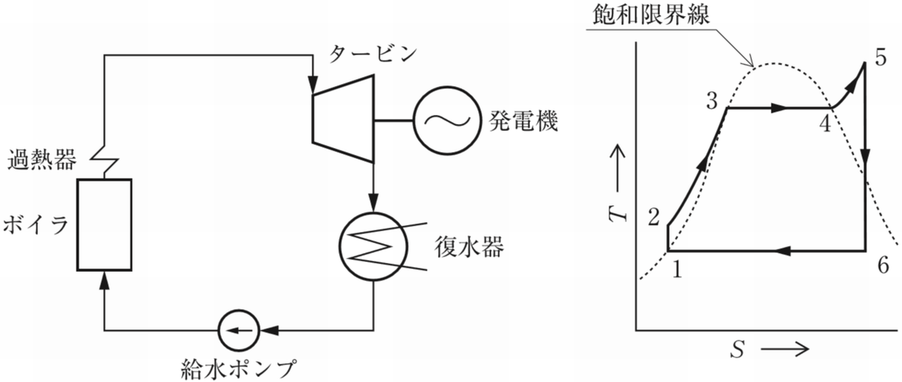 図に示す汽力発電のランキンサイクルにおいて,タービンの入口から出口に至る蒸気のエントロピー S と絶対温度 T の変化を示す過程として,